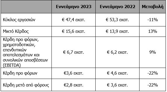 · Τα κέρδη μετά από φόρους ανήλθαν σε 2,8 εκατ. ευρώ έναντι 3,6 εκατ. ευρώ την αντίστοιχη περίοδο του 2022.