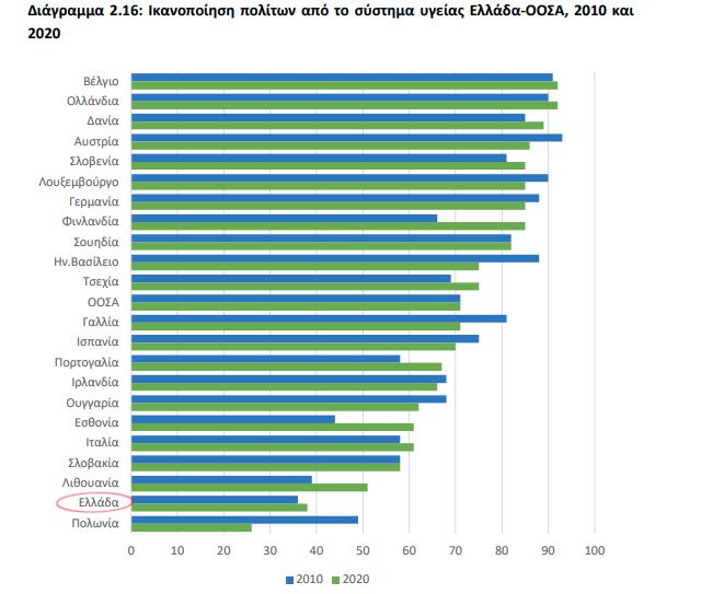 Υψηλός βαθμός εμπιστοσύνης εκφράζεται στην Ελλάδα μόνο στον θεσμό της υγείας και του ιατρικού προσωπικού, με όλους τους άλλους θεσμούς που παραθέτει η έρευνας να συγκεντρώνουν υψηλά ποσοστά δυσπιστίας Όμως, η χώρα έχει ένα από τα χαμηλότερα ποσοστά ικανοποίησης από τις παρεχόμενες υπηρεσίες φροντίδας στα Ευρωπαϊκά μέλη του ΟΟΣΑ, με 38% για το 2020, από 36% το 2010.