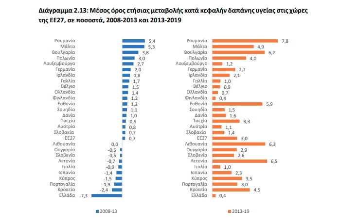 Την περίοδο 2009-2019, η κατά κεφαλήν δαπάνη υγείας μειώθηκε στην Ελλάδα κατά 30%, με μεγαλύτερη μείωση να καταγράφεται στη δημόσια κατά κεφαλήν δαπάνη (-37%), ενώ στην ΕΕ27 τόσο η κατά κεφαλήν δαπάνη όσο και η δημόσια δαπάνη αυξήθηκαν κατά 30% και 32% την ίδια περίοδο. Ανά χώρα, την περίοδο 2013-2019 η κατά κεφαλήν δαπάνη υγείας στην Ελλάδα παρουσίασε τη μικρότερη αύξηση (+0,4%) μεταξύ των χωρών του ΟΟΣΑ.