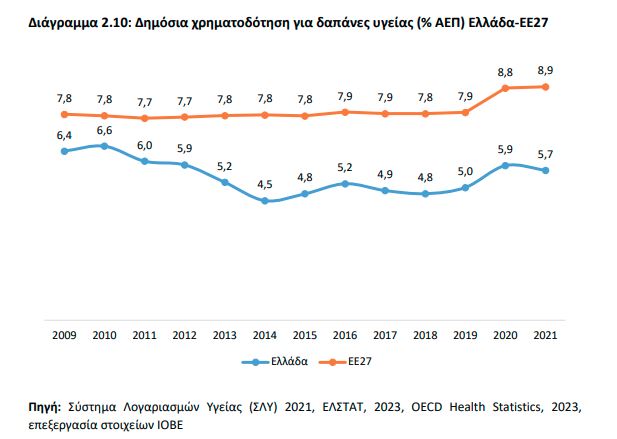 Σύμφωνα με την έκθεση του ΙΟΒΕ για «Τα οικονομικά των δημόσιων νοσοκομείων στην Ελλάδα» η συνολική χρηματοδότηση για δαπάνες υγείας το 2021 σε σύγκριση με το 2009 είναι αυξημένη κατά 28,6% στην ΕΕ, ενώ είναι μειωμένη κατά 22,1% στην Ελλάδα. Η δημόσια χρηματοδότηση για δαπάνες υγείας είναι αυξημένη κατά 32,7% στην ΕΕ, ενώ στην Ελλάδα η μείωση προσεγγίζει το 29,2%.