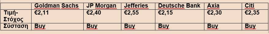 Ο Jefferies ανέφερε σε σημείωμα της 7ης Μαρτίου ότι η νέα κρίση του EPS της διοίκησης στα 0,35 ευρώ το 2025 θα μπορούσε να οδηγήσει σε αύξηση 10% σε σχέσης με τις εκτιμήσεις των αναλυτών, που έγιναν σήμερα (11/03), ωθώντας τον υψηλότερο στόχο της τιμής της τράπεζας στα 2,55 ευρώ.