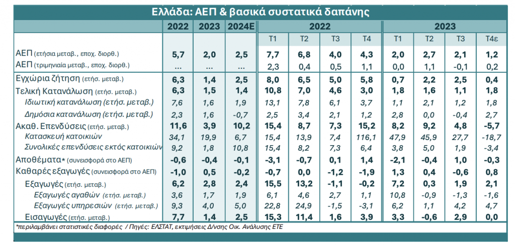 Η μείωση της αγροτικής παραγωγής λόγω της καταστροφικής πλημμύρας στη Θεσσαλία και η προσωρινή εξασθένηση των πάγιων επενδύσεων επιβράδυναν την οικονομική δραστηριότητα το τέταρτο τρίμηνο του 2023, αλλά η ανάπτυξη ιδεών προβλέπεται να επιταχυνθεί στο 2,5% ή ακόμη περισσότερο το 2024, σύμφωνα με ανάλυση κειμένου της Εθνικής Τράπεζα. Η ενίσχυση των μηνιαίων βασικών δεικτών οικονομικής δραστηριότητας προαναγγέλλει επιτάχυνση της αύξησης του ΑΕΠ το πρώτο τρίμηνο του 2024 στο 1,8% ετησίως (0,7% εποχικά προσαρμοσμένο, σε τριμηνιαία βάση), σύμφωνα με την επικαιροποιημένη πρόβλεψη του Τμήματος Εθνικής Οικονομικής Ανάλυσης. η οποία διατηρεί την πρόβλεψη ανάπτυξης για υψηλότερο {επίπεδο} φέτος.