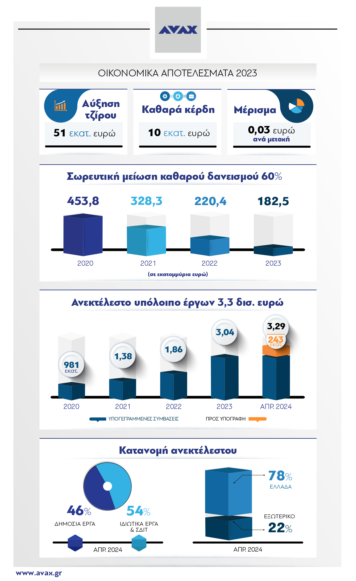 Σύμφωνα με την ανακοίνωση της εταιρείας, το 2023 θα σημειωθεί αύξηση του κύκλου εργασιών κατά 12,6%, ο οποίος έφτασε τα 453,5 εκατ. ευρώ έναντι 402,7 εκατ. ευρώ το 2022. Παράλληλα, η εντυπωσιακή μείωση του Καθαρού Χρέους της εταιρείας συνεχίστηκε και το επόμενο έτος κατά 37,9 εκατ. ευρώ το 2023 (-17,2% σε σύγκριση με το 2022 και -59,8% σε σύγκριση με το 2020), ενώ το ανεκτέλεστο έργο κατέγραψε ιστορικό υψηλό 3,3 δισ. ευρώ. Μάλιστα, αν και η ΑΒΑΞ «τρέχει» το μεγαλύτερο δημόσιο έργο της χώρας, την 4η γραμμή του μετρό στην Αθήνα, η εταιρεία δεν βασίζεται σε δημόσια έργα, αλλά αντιθέτως, σε ένα χαρτοφυλάκιο εκκρεμών έργων, ιδιωτικά έργα και ΣΔΙΤ αντιπροσωπεύουν 54% του συνόλου.