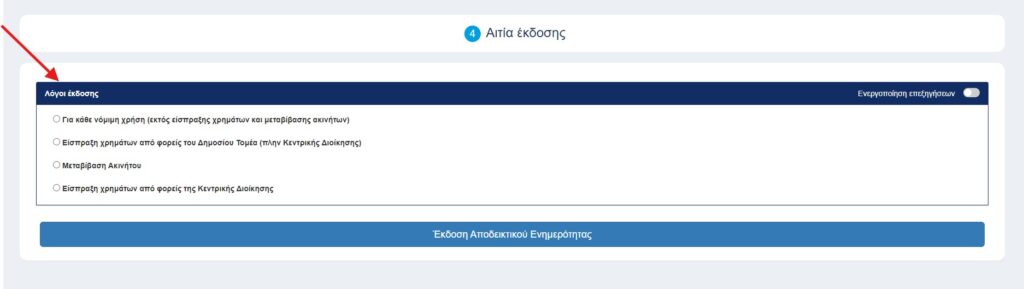 Στην επόμενη σελίδα εισάγω την αιτιολογία της φορολογικής ενημερότητας και τον ΑΦΜ του φορέα που θα κατατεθεί και επιλέγω έκδοση
